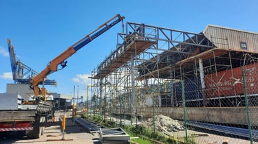 Reparo civil nos galpões estruturados, com troca de telhas, calhas, rufos, cumeeiras, projeto de cabo de vida, instalação de linha devida em área de aproximadamente 5.000 m2, altura de trabalho de aproximadamente 20m - Sepetiba Tecon - Terminal de Contêineres do Porto de Itaguaí - Estado do Rio de Janeiro