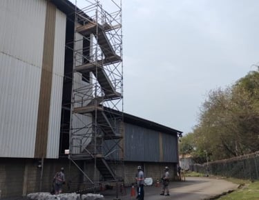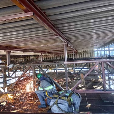 Reparo civil nos galpões estruturados, com troca de telhas, calhas, rufos, cumeeiras, projeto de cabo de vida, instalação de linha devida em área de aproximadamente 5.000 m2, altura de trabalho de aproximadamente 20m
